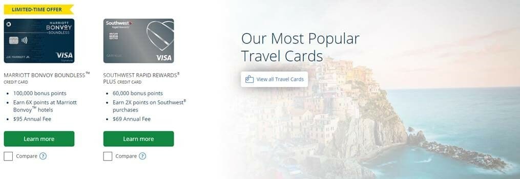 Chase.com’s landing page for credit cards immediately states: ‘A card for every need’. This is noticed by potential customer: they feel personally addressed by this statement. Upon scrolling down the website provides the visitor with images of different offers e.g. different card options.