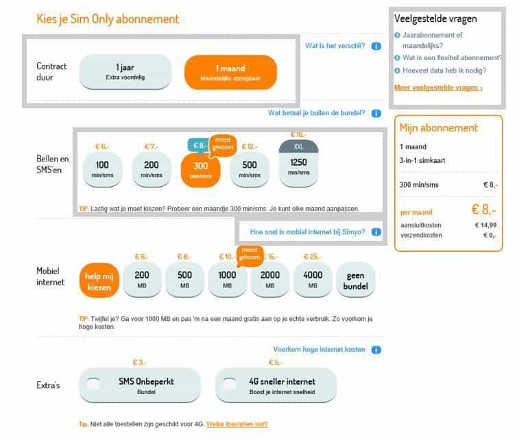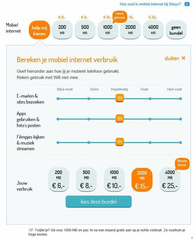 Also clever: showing popularity information by displaying the ‘most selected’ bundle. Simyo.nl shows this information in two ways: by means of a tip, and directly in the tool inside a little balloon.