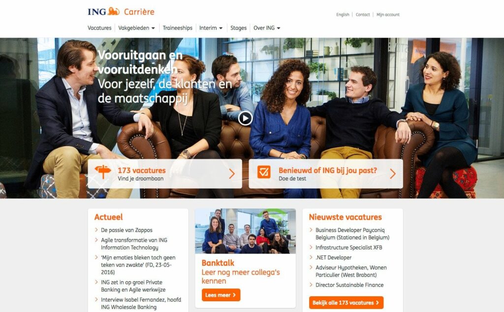ING.nl does this well by displaying two CTA (Call-to-Action) buttons with clear CTA text. Stating the number of vacancies and challenging you to find your dream job in their list of vacancies, is the answer to the first question. Then they literally ask you the second question, challenging you to find out whether ING suits you. This makes it very tempting for jobseekers to look further into working for ING.