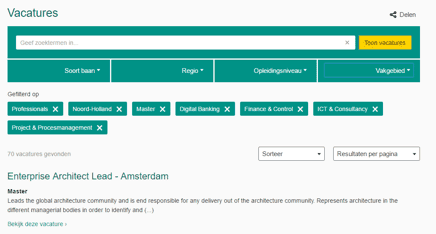Large recruitment pages often contain hundreds of vacancies. It is therefore crucial to have a good built-in filtering system, which enables people to find a suitable job. If you were, for instance, looking to buy a pair of shoes online, you’d like to be able to refine your search based on size, material, type, or colour. ABN AMRO (338 vacancies at the time of the study) have therefore built a comprehensive filtering system. Just like entering your shoe size, you first fill in your profile, and then you pick the field within which you want to search. You’re also free to use your own keywords. This way, it is easy to find the job that suits you.