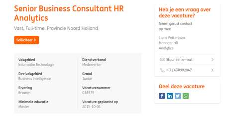 ING.nl makes sure that this button is always visible on the careers page, with its striking orange ING colour. Located at the top of the page for visitors who want to apply immediately, and at the bottom of the page for visitors who prefer to sit back and read the entire description first.