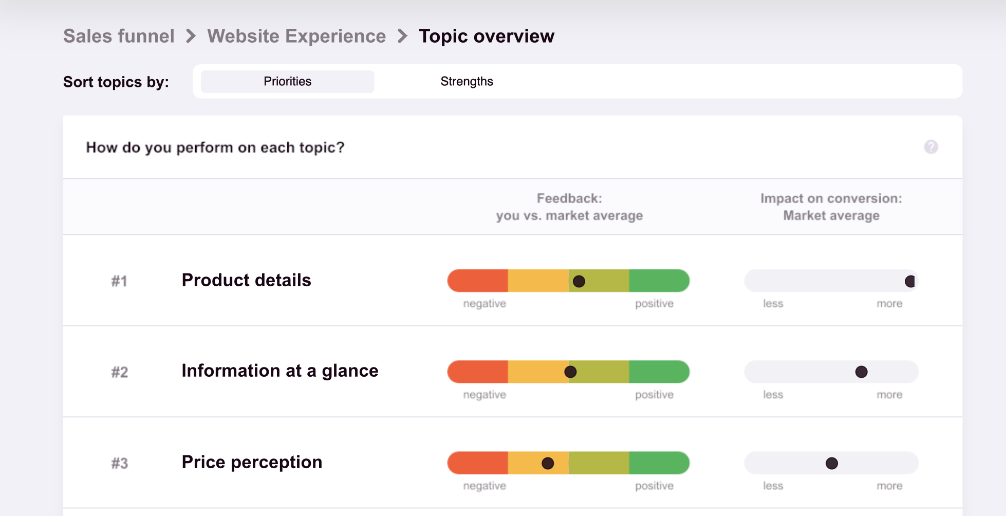 Each response is weighted by volume and total effect on conversion, so frequent "complaints" are only considered relevant if they actually influence the final decision.
