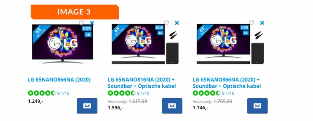 Look at the suggestions offered by the Coolblue decision-making tool shown below in Image 3, for example. After the consumer enters three preferences, the tool narrows down the selection to three TVs. Because of the extreme aversion bias, most consumers will tend to choose the middle option.