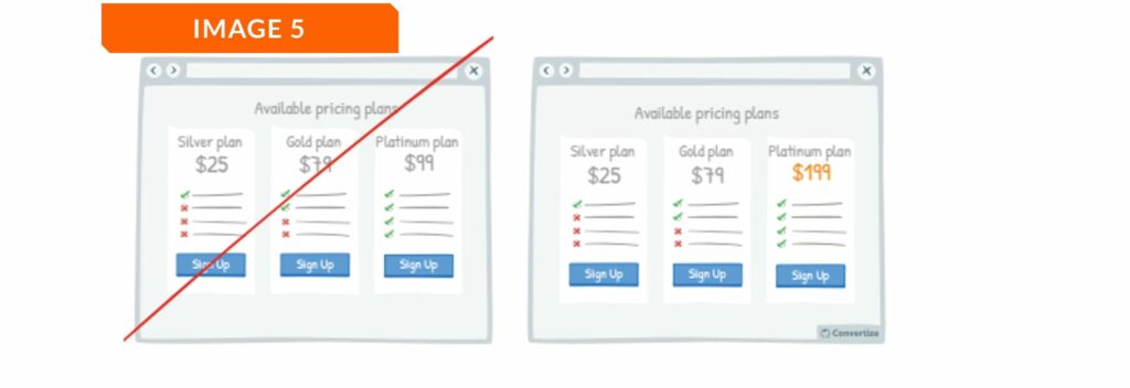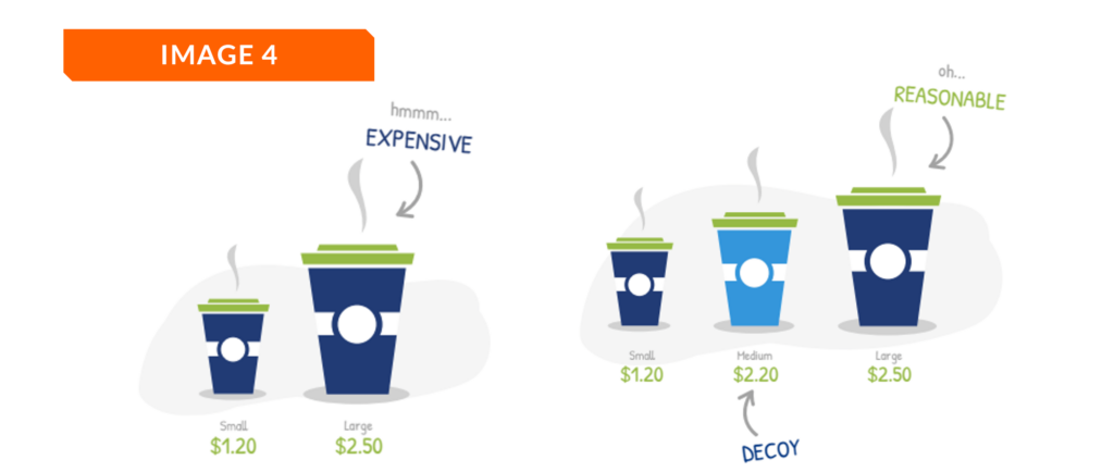 The second option for using the decoy effect is to add a third option that is disproportionately more expensive (Image 5). Suppose you own an online shop and you offer your customers three different price plans. The top plan, the ‘platinum’ plan has basically all the same features as the middle plan, the ‘gold’ plan, but comes at a much higher price. That makes the gold plan instantly seem like a much better deal. Consumers then feel like they’re getting a better bargain for their money in comparison with the more expensive third option. Despite its high price, the platinum plan only gives them a few extras, so consumers feel like they are saving money with the gold plan without compromising much on quality.