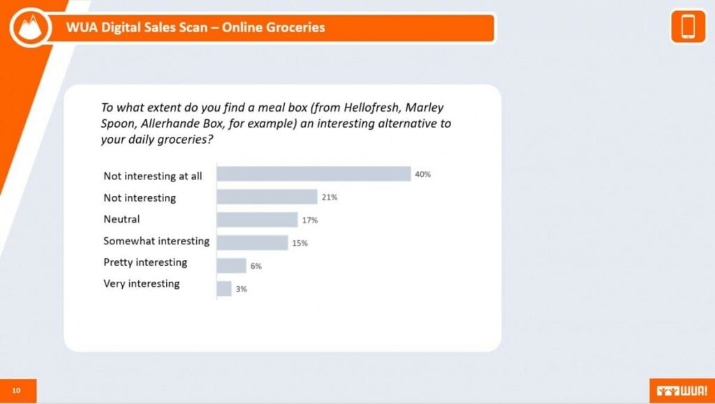 In the recently conducted Online Grocery Shopping study, among 200 respondents on smartphone, it became clear that consumers don’t have a preference for a meal box. On the question in how far the respondent feels meal boxes offer an attractive alternative to daily groceries, 61 % say they don’t find this interesting or are not interested at all.