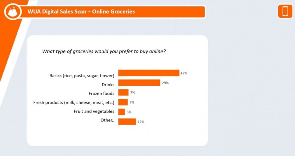 The food items consumers prefer to buy online are mostly basic food items such as rice, pasta, sugar, and flour (42% of respondents say this). Another 29% say they also prefer to buy drinks online. Frozen goods, fresh products like milk and cheese, vegetables and fruit are bought online by 5 to 7% of respondents.