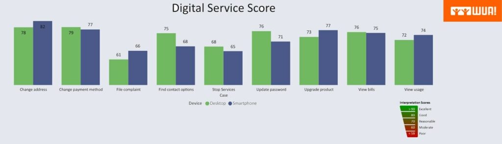 Meanwhile, however, customers give “File complaint” a lower score (63). That’s close to 10 points lower than the other scores on the other tasks on average (the average is 72.9823). In other words, “File complaint” could be an important service journey to improve for your online team. Diving into the data, understanding the WHY behind the lower scores on both functional, rational and emotional levels will give your digital teams the right indications on where to improve.