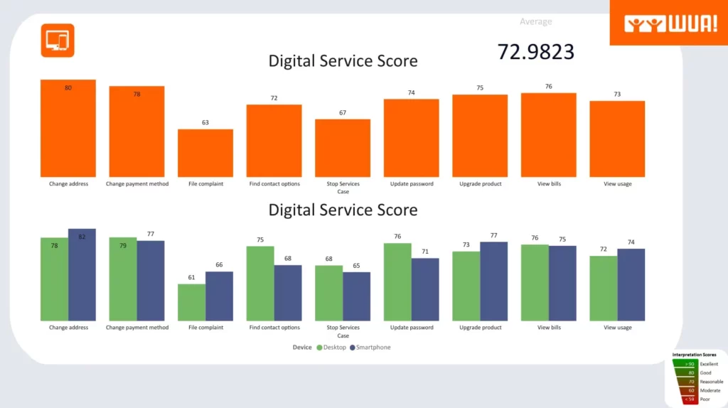 The WUA Dashboard shows you, in one overview, the digital service performance for all these 19 tasks, from “Change address,” to “Pay bill,” to “File a claim”. Both on your desktop or smartphone, per metric, per task. We ask hundreds of real customers of health insurance providers to perform real service tasks on their desktop or smartphone. We ask them to fill out our benchmark Service survey with standardized questions on digital service performance.
