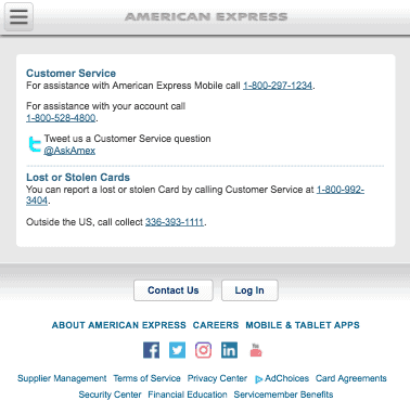 Finding a credit card on a smartphone may have its drawbacks, but it also has some real benefits, if the page is designed right. Respondents searching for credit cards on a smartphone were especially pleased with how American Express places their contact details in clear sight on each page.Within the main menu and at the bottom of each page, the customer support line and Twitter handle are listed and clickable. This is especially useful on a smartphone as a click on the phone number will lead directly to a call. Making contact details easy to find is also a simple way for American Express to gain trust and show they are happy to communicate with customers.