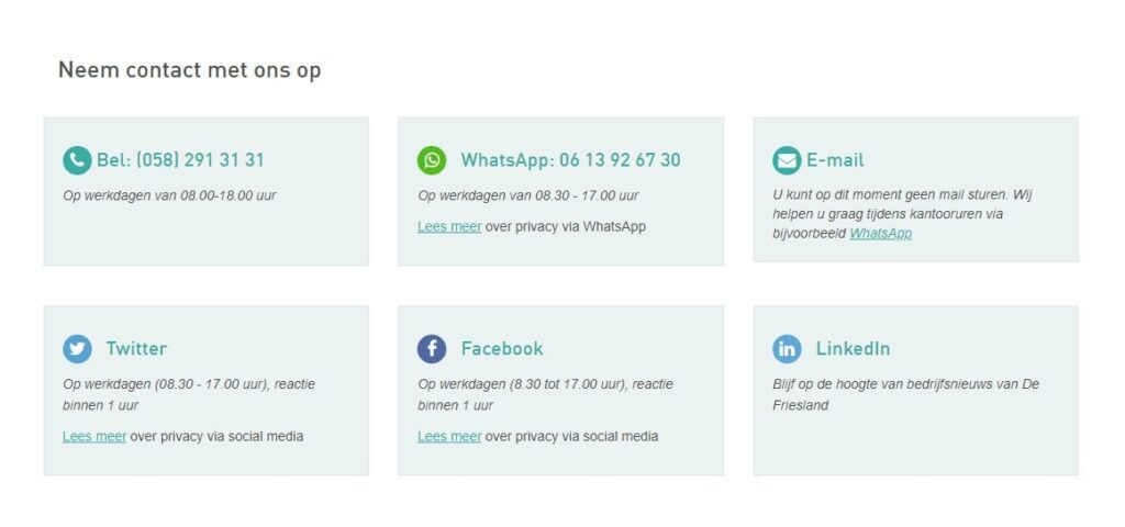 These contact options are easily found on the website of health insurer DeFriesland.nl. Customers have the option of quick contact through Whatsapp, or to ask questions through other social media platforms.