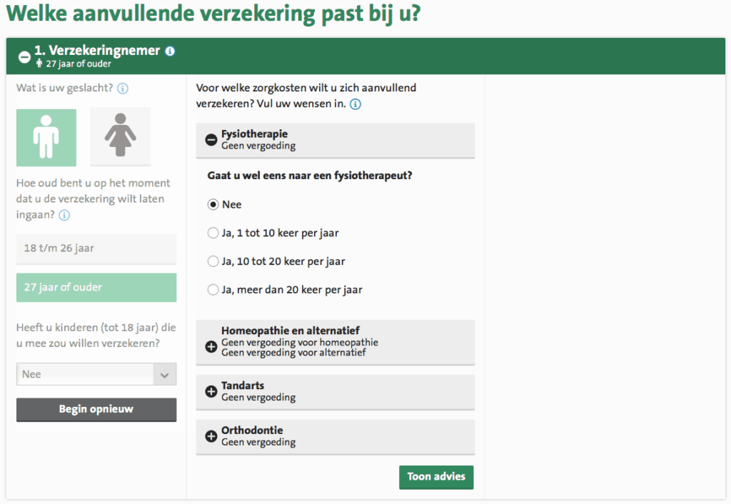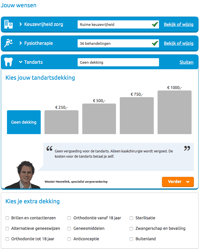 ZorgKiezer.nl also knows how to put itself in the consumer's situation. In a number of clear and organized steps, the consumer is asked to indicate their preferences in the 'Your wishes' block. These are choices regarding freedom of choice, physiotherapy, and dentist. For each option, a health insurance specialist from ZorgKiezer.nl briefly indicates in which situation it's handy to choose a particular option. At the end, one can still choose additional extra coverage that ZorgKiezer.nl should take into account when presenting the offering. Think, for example, of glasses and contact lenses, or alternative medicine.