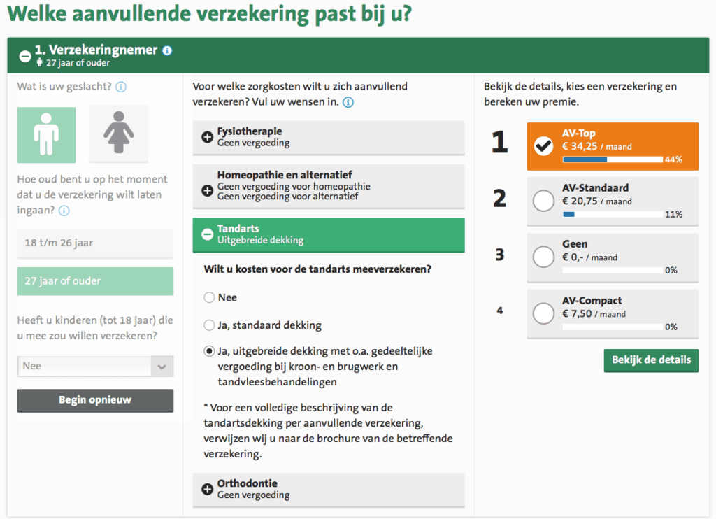 DSW.nl also scores highest in this Health Insurance research when it comes to consumers who could find all necessary information to make a choice. DSW.nl shows a complete overview of the various supplementary insurance products directly on their homepage. Because the various names ('AV-Compact', 'AV-top', etc.) won't immediately ring a bell for all visitors, DSW.nl shows a clearly visible 'Help me choose' button directly under the row of supplementary insurance products. This leads consumers to an effective, cleverly designed choice guide page. The page shows consumers in three clear steps a supplementary insurance that best fits the consumer's personal situation. Consumers are very charmed by this: "They immediately ask if I need help." and "Clear comparison material for supplementary insurance."