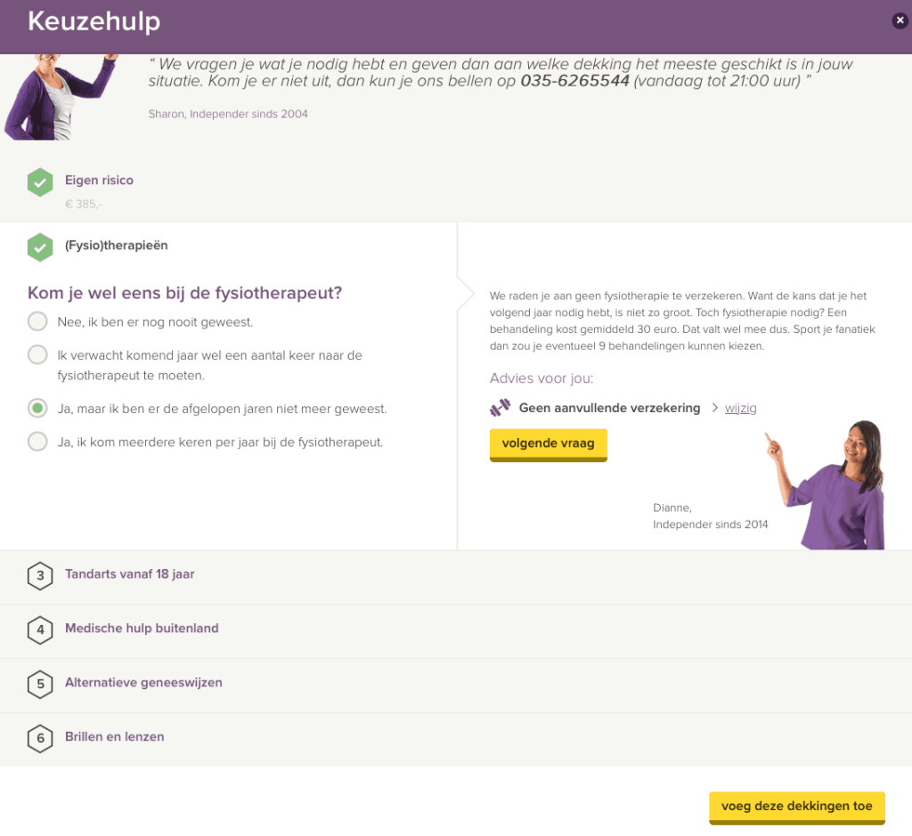 As soon as the consumer makes a choice (for example, for the statement 'Do you sometimes visit the physiotherapist' chooses the answer 'Yes, but I haven't been there in recent years') Dianne, an Independer employee, appears on screen who immediately gives advice about the supplementary insurance to take. In this example, she advises not to insure physiotherapy and tells what the costs are if one would still visit the physiotherapist.