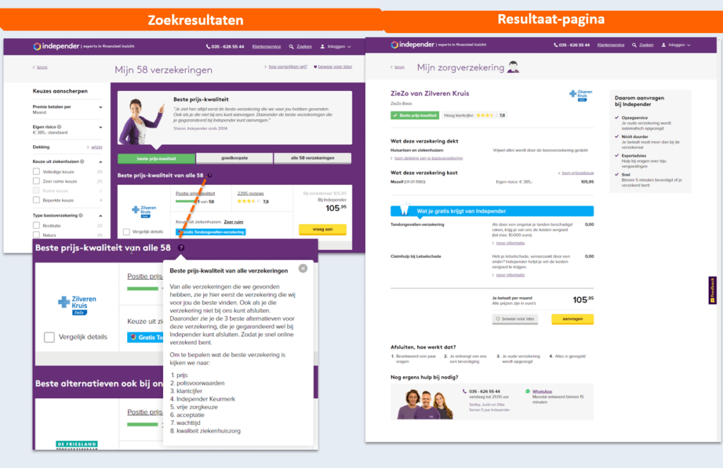 Combined with all the information Independer.nl has of its visitors at that moment, there’s a strong perception that it shows the offer at a competitive price. How the price-to-quality ratio is constructed is explained further below the (?) of information. Independer.nl’s openness about this contributes to the trust people have – something done very differently by CZ.nl, for example.