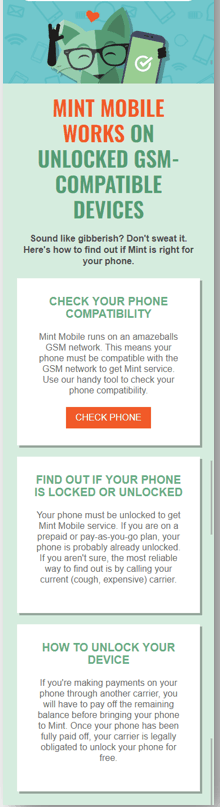 Below, Mint Mobile manages expectations in three simple steps. Mint Mobile helps consumers ensure their mobile service will work by explaining that it requires their phone to be unlocked.