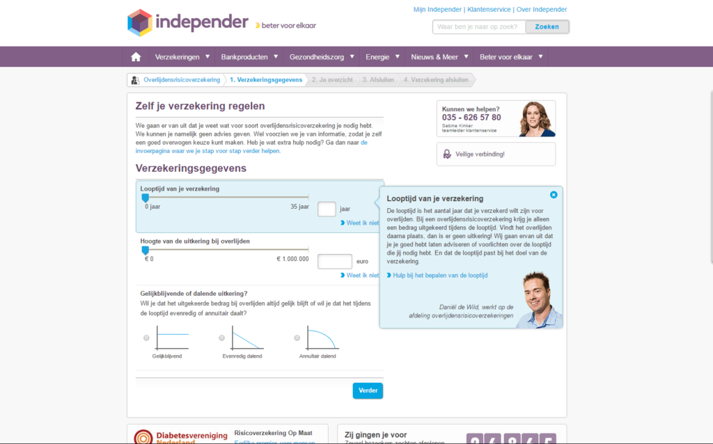 Independer.nl likes to offer visitors a helping hand when answering questions related to calculating a premium for a life insurance policy. Independer.nl takes the time to help visitors with difficult questions. This way, uncertainty is removed, and the visitor knows exactly what they are getting, and it motivates them to continue online.