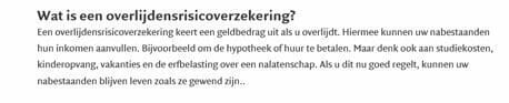 The average consumer doesn’t have an overview of all life insurance offerings, let alone products that are in some way related. The example of Monuta, where people initially believe they are looking at life insurance policies, says it all. Organizations in the insurance industry would benefit from continuously approaching the content of their websites from the consumer’s perspective. Keep asking yourself ‘Are we really explaining the products clearly enough when we look at them from a broader perspective? Do we know more than what A/B testing, usability tests, and research among our own employees have shown?’.