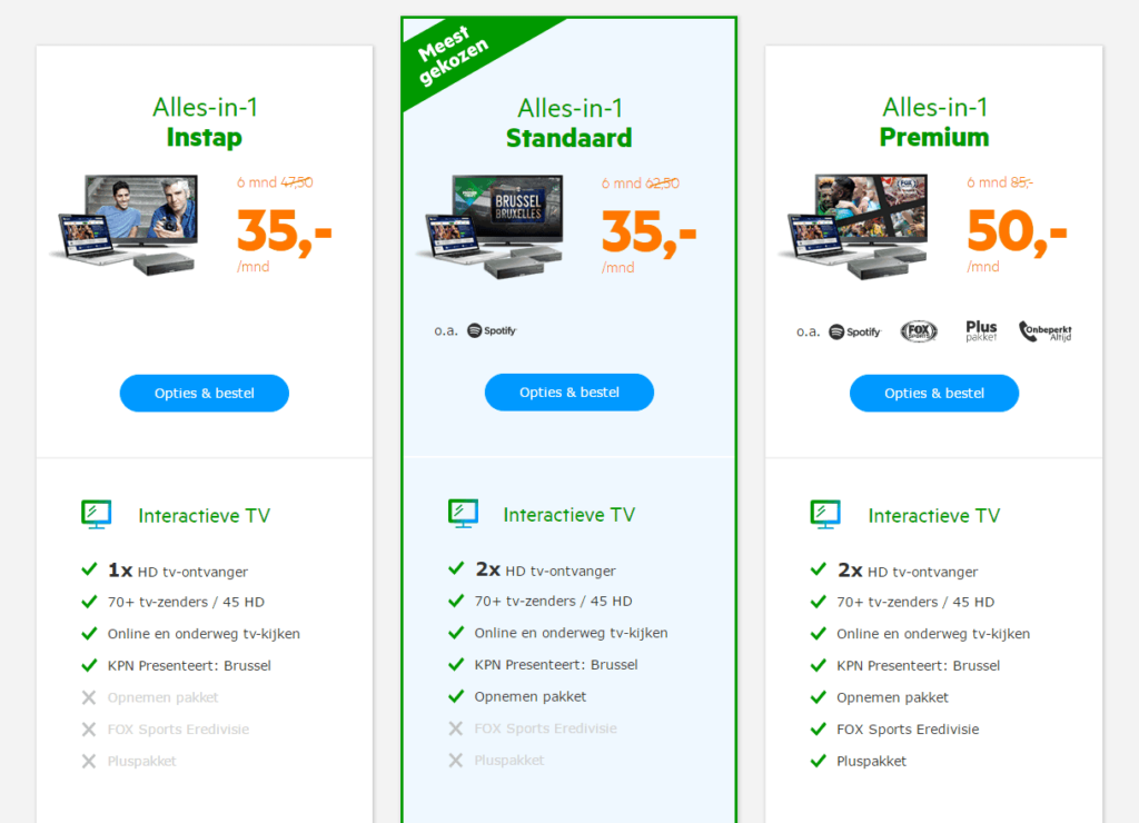 Another respondent states: "Clear what the packages contain and the prices." And: "Benefits clearly under and next to each other, you can very easily compare the different packages." This method also makes comparison very easy. A telecom package consists of 3 elements: an internet element, a TV element and often a telephony element.