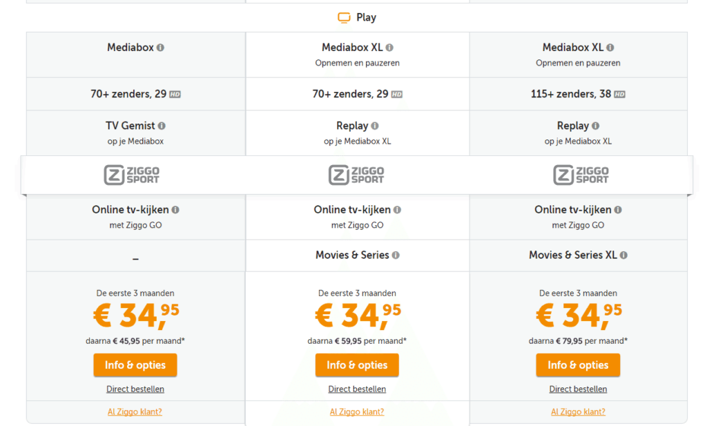 KPN.com displays all TV options well next to each other, which makes comparison possible. The provider has cleverly chosen to list all features for all packages. Depending on the package, an aspect gets a checkmark or a cross. This makes the distinction clear. Ziggo.nl (see the screenshot below) ensures that even at the bottom of the list, the different aspects remain at the same height. This way, distinction and value are equally clear.