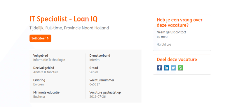It is important that the PDP page (vacancies page) starts with the most important information. ING.nl, the number 2 in the study behind ABN AMRO, starts with a title that includes the job title. Then, the description lists details about the position: the duration, the number of hours, and the location. Below that, there is a short, clear table that contains the most important information. This ensures that the jobseeker can clearly see at a glance what the position entails.