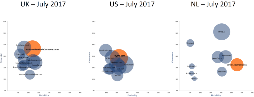 The most important first step in the sales funnel is that your target audience reaches your website. In the United Kingdom and the United States, there are no strong winners when it comes to findability. In these countries, the private lease providers have a much lower findability than in The Netherlands. LeaseCar.uk has the highest findability in the UK market (27%) and TrueCar.com is found the most in the US (28%), whereas the highest findability in The Netherlands lies at 55% for DirectLeasePrivate.nl. The reason for these differences is not necessarily the fact that the Dutch market is smaller than the US and UK markets: Our car insurance study in the UK shows a findability of 55% to 59% for the top 3 players in that market, and they are far ahead of the other providers in terms of findability.