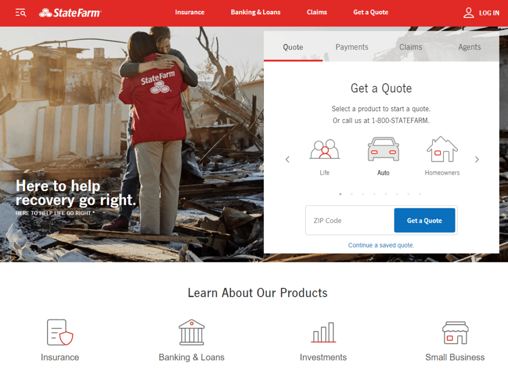 State Farm indicates they are here to help. This is clearly visible in the images used on the website. The website shows an image of a man, his house that burned down, and a State Farm employee that comforts him – accompanied by the quote “Here to help recovery go right”. This clearly portrays the insurer’s message: we offer you protection. This is appreciated by the customer: “With all the disasters lately, I like the picture and the saying they have on their opening page. It had two people standing and hugging where their house used to be after a fire. It said, ‘let us help you recover’. It is good to know that a company can relate to that kind of pain and suffering”.