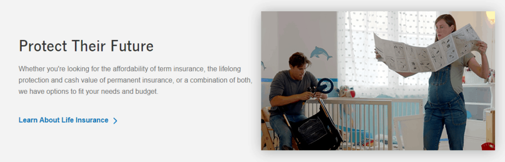 The insurer takes this even further by using the quote “protect their future”. In the image below two parents-to-be are anticipating the future: a future in which their baby will need a bed and a stroller. Insurance has a double meaning in this case: the child will be insured by you and thereby protected by you.