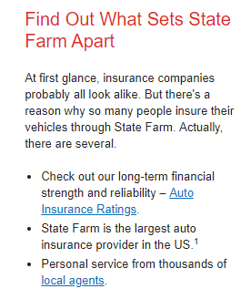 Insurers typically resemble each other at first sight. State Farm recognizes and emphasizes this while immediately providing extra reasons to take out insurance with them: “Insurance companies probably all look alike. But there is a reason why so many people insure their vehicles through State Farm. Actually, there are several.” Regarding car insurance, the insurer adds: