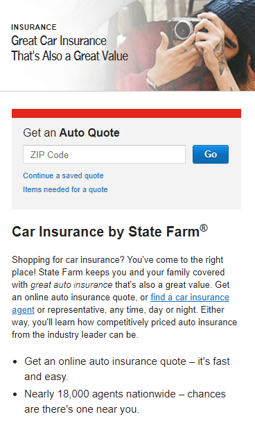 The combination of an image with a person in a car, the mention of the words ‘car insurance’, and the clear focus of the content on car insurance – all contribute to the feeling that the customer has found the right webpage. State Farm emphasizes this by using the phrase: “Shopping for car insurance? You’ve come to the right place!” – after which they go on to explain why State Farm is the ‘right place’ by using the quote: “Great insurance, great value”.