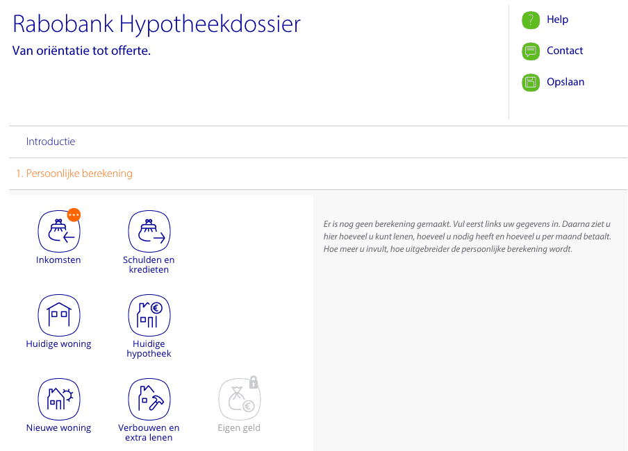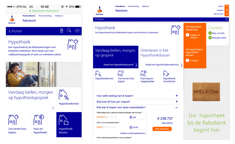 This way, Rabobank actually responds in 1 environment to two very different visitors with vastly different information needs: the already advanced mortgage shopper who has their numbers in order and maybe has already purchased a house or is about to do so, and the "snack shopper" who wants to quickly see what the possibilities are but would be put off by filling in a multitude of data.
