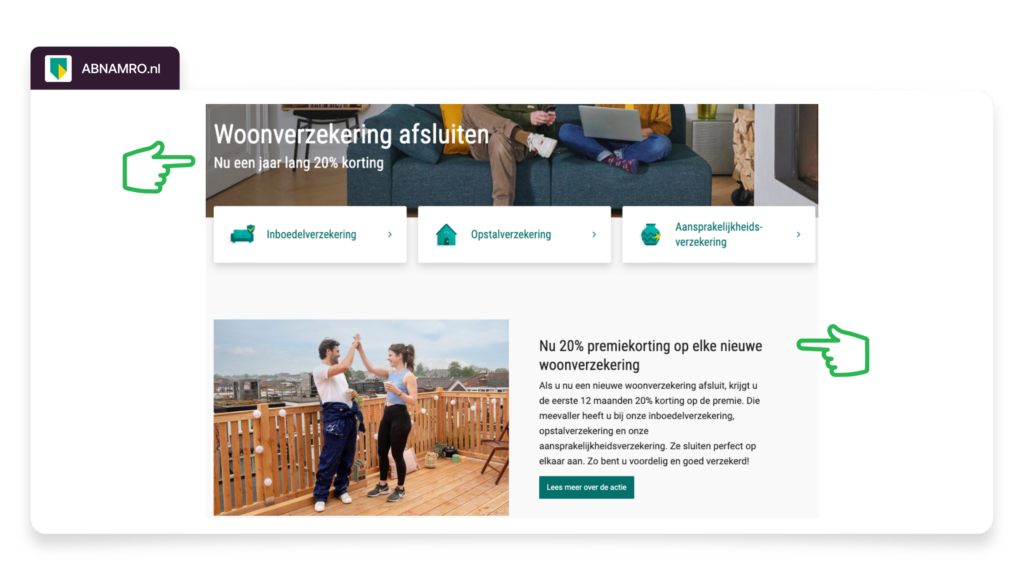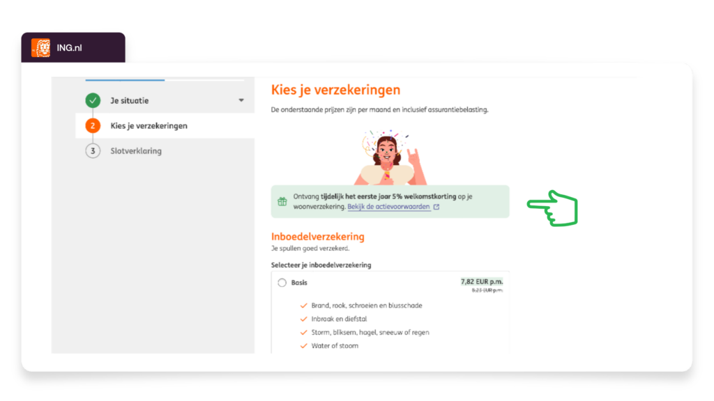 A welcome discount, as applied by ING.nl and ABNAMRO.nl, plays into consumers' need for a financial advantage when entering a new contract. This strategy lowers the barrier for new customers and improves price perception in favor of the insurer.