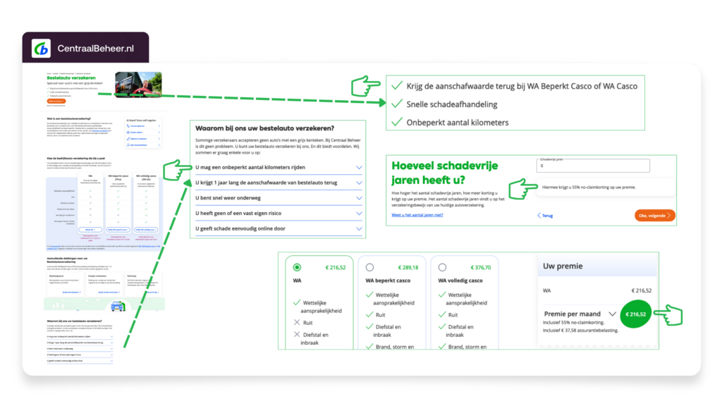 CentraalBeheer.nl convinces visitors by integrating price-related elements throughout the entire customer journey. From the first page, two price-related and one service-oriented unique selling propositions (USPs) are displayed. Lower on the page, benefits are clearly listed, repeatedly convincing the consumer of the value of the offer. In the premium calculation, the no-claims discount is immediately displayed when entering claim-free years. Finally, package prices are displayed in green, with the total premium amount circled in green. These visual elements ensure that price perception is influenced in a positive way.
