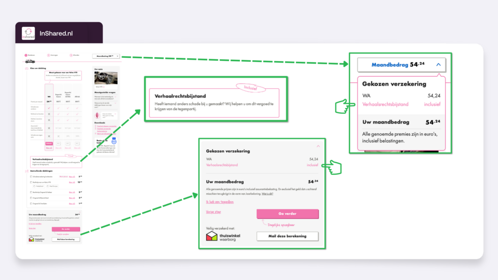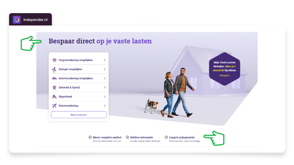 InShared.nl and Independer.nl focus on strengthening price perception by showing price-related benefits from the first interaction. By introducing elements like free coverage, savings opportunities, and lowest price guarantees early in the customer journey, the consumer feels directly engaged and convinced of the added value.