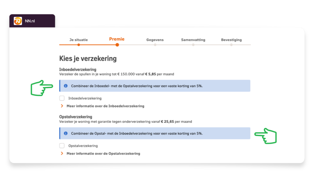 Insurers like NN.nl and Univé actively offer package discounts during premium calculation, allowing the customer to immediately see the benefits. By making these discounts visible instead of hiding them on a separate page, they create a sense of value and transparency.