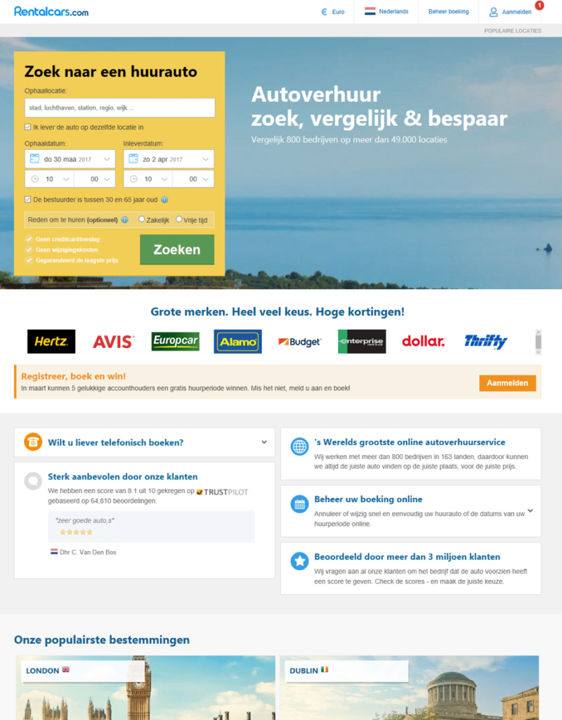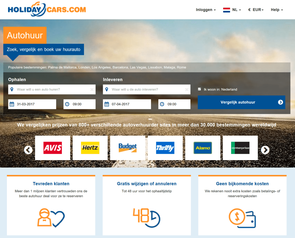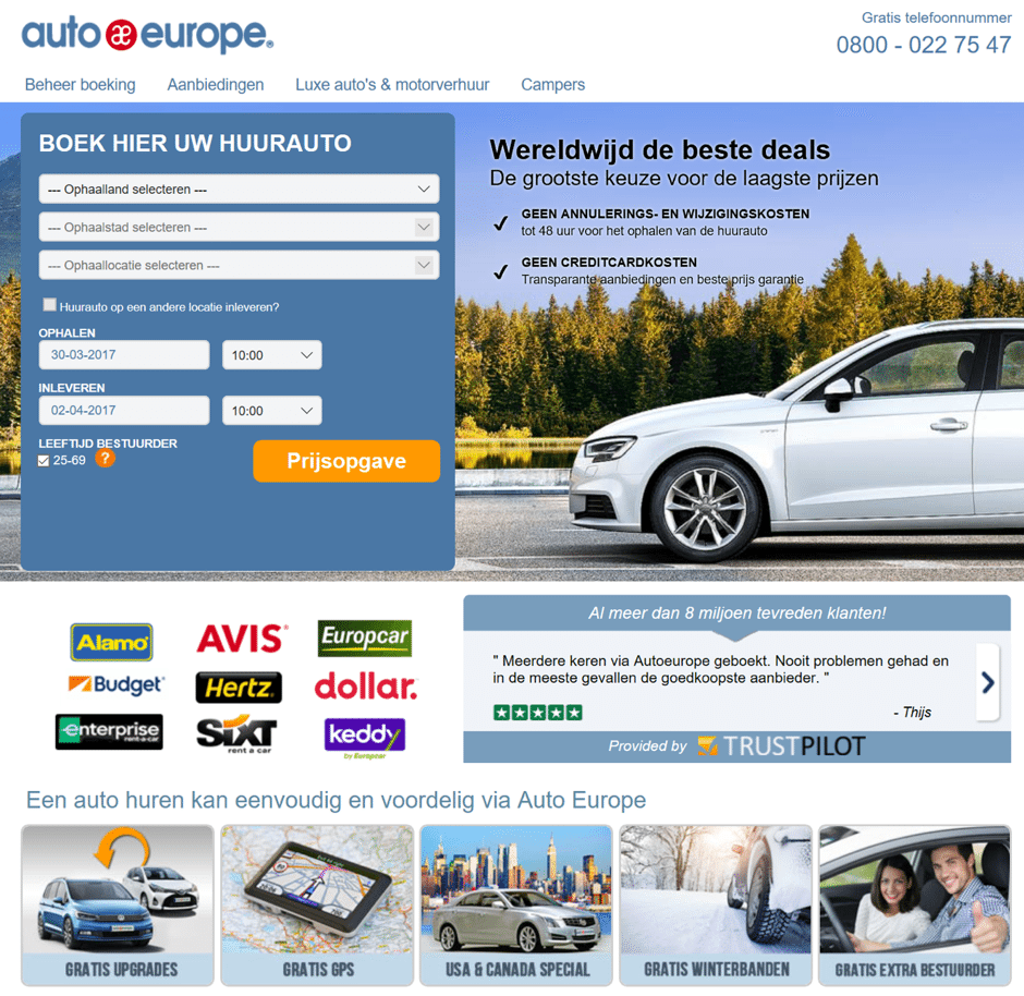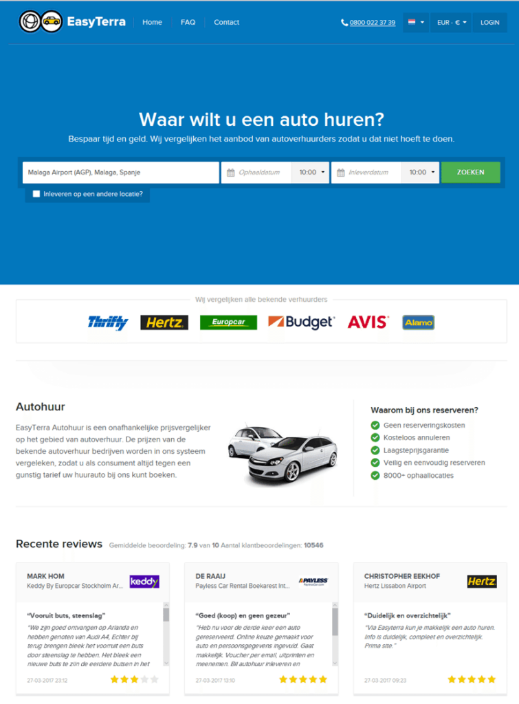 EasyTerra.nl immediately shows USPs and user reviews to convince visitors that this provider is a good choice. This is also the case with the other high-scoring providers rentalcars.com and AutoEurope.nl.