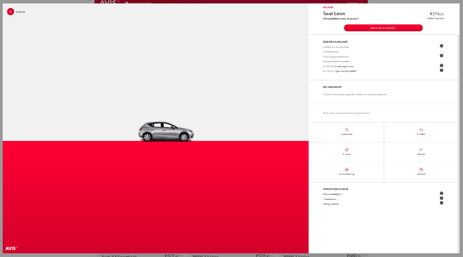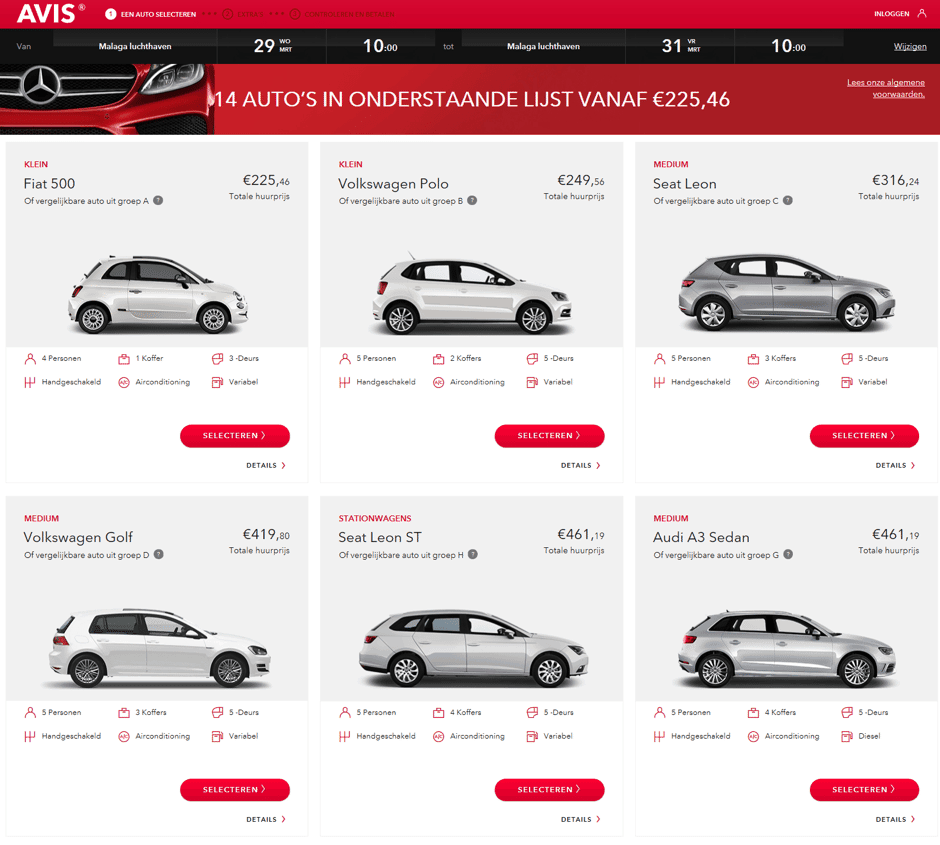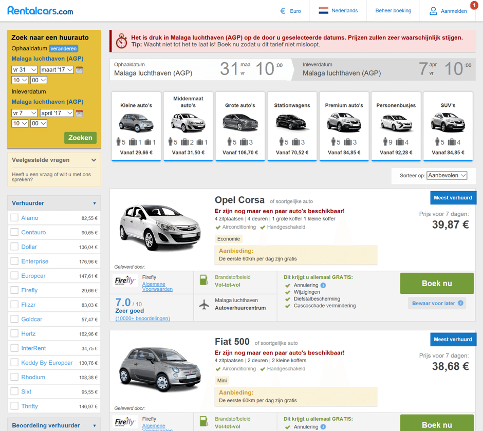 An aspect of rentalcars.com that users appreciate is that it clearly indicates how many people and suitcases fit in the offered cars. Avis.nl also shows this in the overview. "The information about how many people and suitcases is handy." (Rentalcars.com)