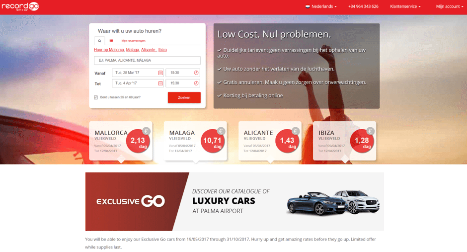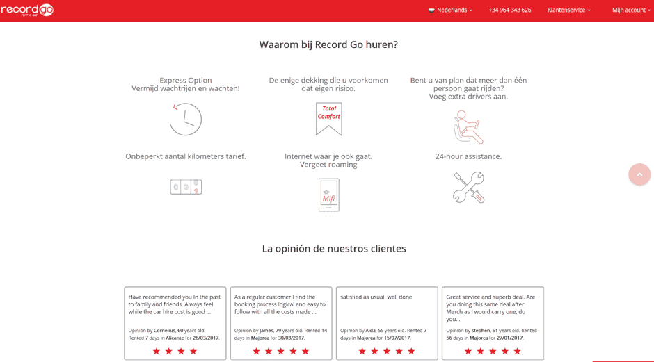 User reviews or reasons to choose Recordrentacar.com or Avis.nl are not immediately shown, which is the case with the best-scoring providers. On Recordrentacar.com, users have to scroll down for this.