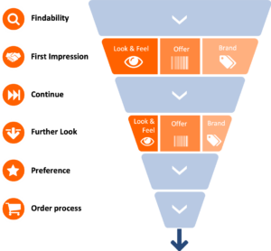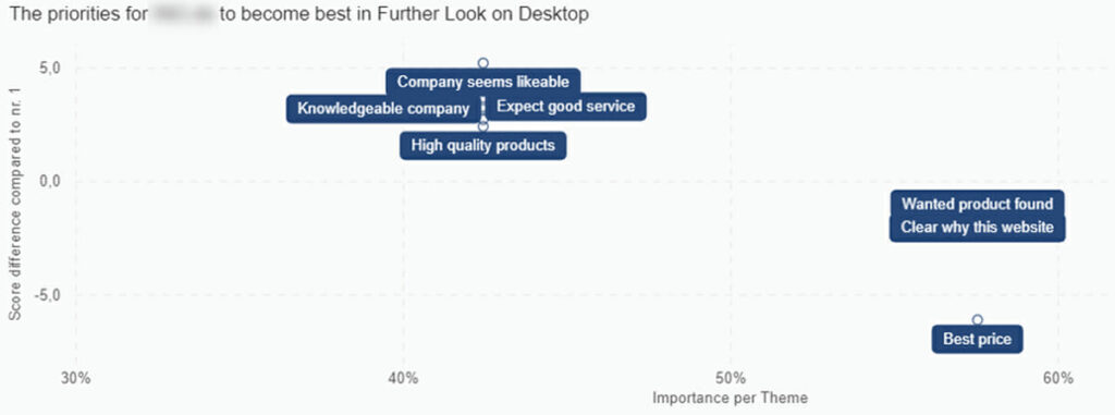 Moreover, we can calculate similar CX-priorities in the Further Look phase: by conducting regression analyses on the themes Offer and Brand in this phase (since Look & Feel has a more indirect impact here), we know which themes are most important in creating consumer preference for a website within a market. Pairing this data with the CX-scores of underlying components of the themes (e.g., perceived expertise, price perception) and comparing them to scores of competitors, CX-priorities come to light.