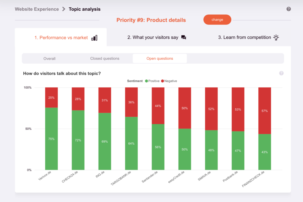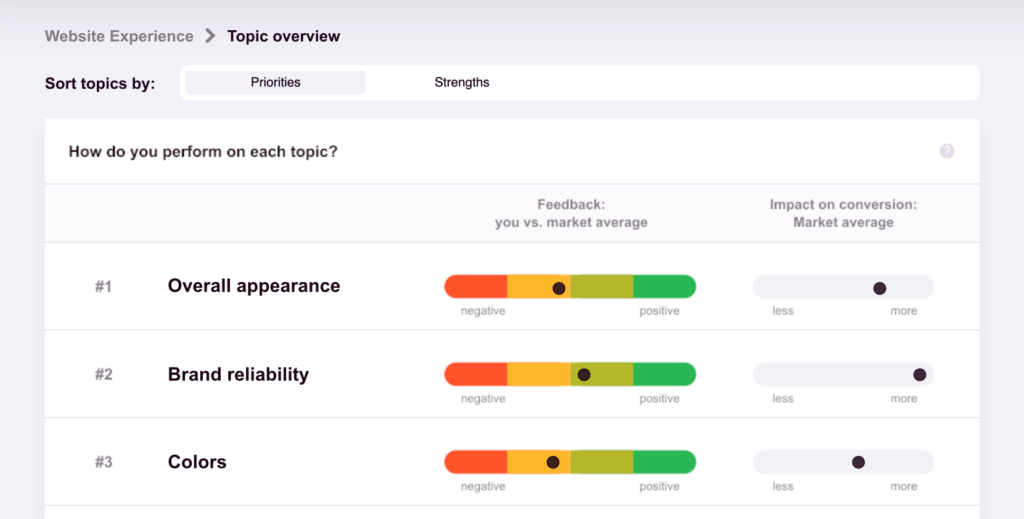 Thanks to the power of machine learning, complex, qualitative data is now linked to quantitative, hard data. Each response is linked to relevant topics (making them easier to analyze), and you immediately have insight into the average sentiment per topic and website.