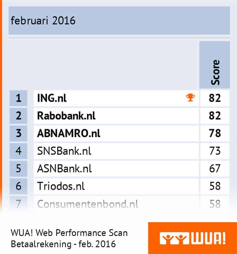 Net zoals bij het desktoponderzoek is de top 4 gereserveerd voor de 4 grootbanken. ING.nl eindigt opnieuw op de eerste plaats (82 punten), nu samen met Rabobank.nl. ABNAMRO.nl neemt met 79 punten de derde plaats in. De afstand met de rest is net zoals bij het desktoponderzoek groot. De top 3 pakt maar liefst 64% van de totale eerste voorkeur in de markt. Dat betekent dat de nummers 4 tot en met 7 het met slechts 36% moeten doen: een stuk kleiner deel van de taart. Uit de rangschikking blijkt dat Triodos.nl op de laatste plaats eindigt met 59 punten.