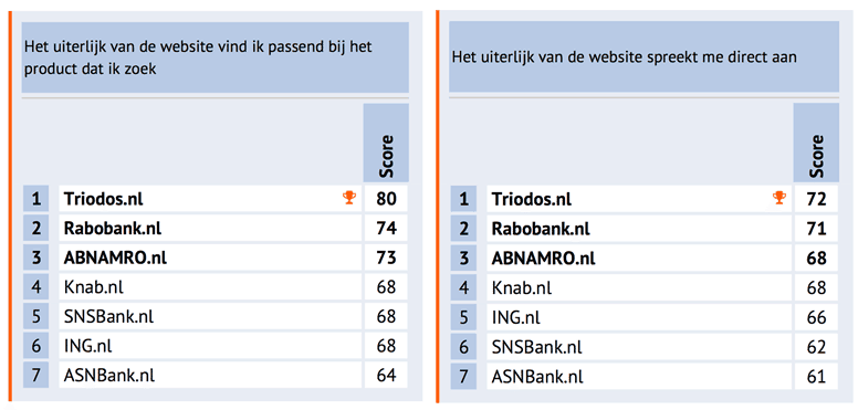 In dit artikel zoomen we daarom in op het onderdeel Look & Feel. Triodos.nl haalt hier op maar liefst 8 van de 13 onderliggende vragen de eerste plek. Bij de overige 5 vragen eindigt de aanbieder telkens op de tweede plaats. Hoe komt dat? Wat doet Triodos.nl bovengemiddeld goed? Waar kunnen andere banken nog iets van opsteken?