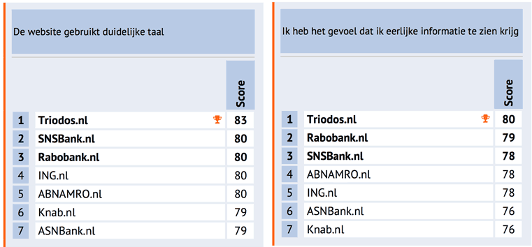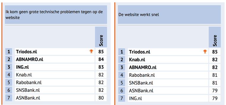 Triodos.nl heeft dit goed op orde en scoort op beide onderdelen de eerste plaats onder de 7 onderzochte websites. Met name het verschil bij ‘de website werkt snel’ is met 3 punten verschil vrij groot ten opzichte van de concurrentie.