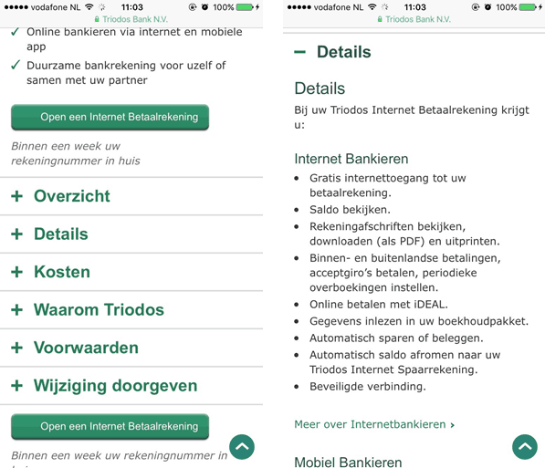 Daarbij geldt dat Triodos.nl de belangrijkste informatie duidelijk en overzichtelijk rangschikt. Men krijgt snel inzicht in de belangrijkste kenmerken van een betaalrekening waarbij informatie kort en krachtig is weergegeven.