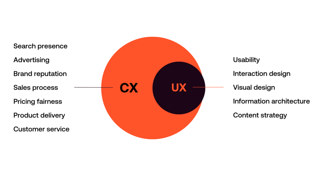 UX is dan ook te zien als een onderdeel van CX, waarbij het gaat om de totale ervaring die een klant met je organisatie heeft via alle beschikbare omnichannel touchpoints, zowel digitaal als fysiek. Dan gaat het dus bijvoorbeeld niet alleen om je bedrijfswebsite en wat consumenten daar zoal kunnen doen, maar om het samenspel van die website met je app, social media, fysieke winkels en alle andere kanalen en touchpoints.