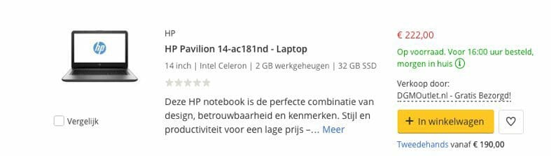 Zoveel mensen, zoveel wensen. Om een zo breed mogelijke doelgroep aan te trekken, is het belangrijk om een breed assortiment aan laptops aan te bieden. Bol.com spant hierbij de kroon met een aanbod van maar liefst ruim 1.300 laptops. Laptopshop.nl heeft een beduidend minder ruim assortiment, maar met bijna 350 modellen lijkt de consument ook hier meer dan genoeg keuze te hebben. Zowel Bol.com als Laptopshop.nl bieden niet alleen nieuwe modellen aan, maar verkopen ook tweedehands (of “tweedekans”, volgens Laptopshop.nl) laptops.