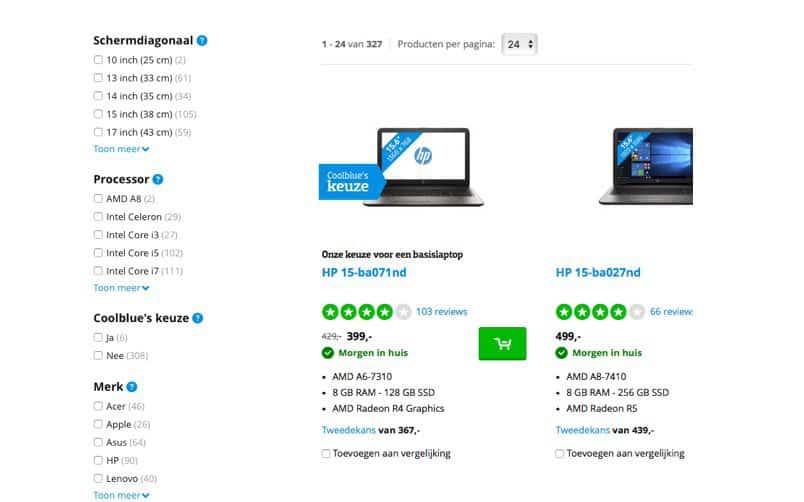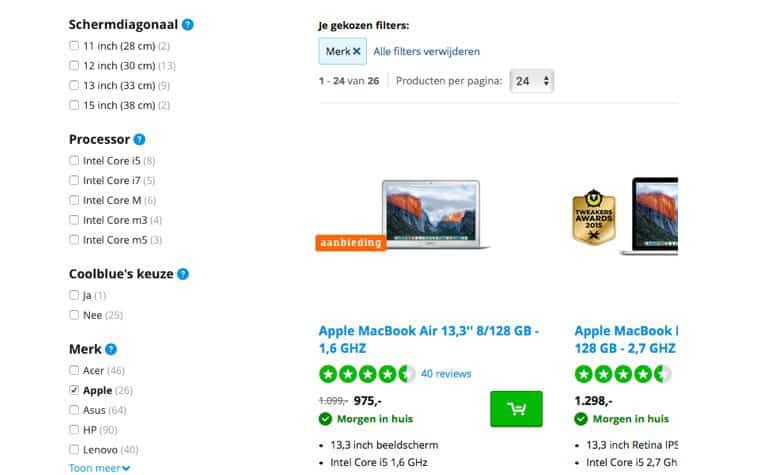 Laptopshop.nl heeft dat bijvoorbeeld goed voor elkaar. Op de overzichtspagina staan aan de linkerkant een hele trits filters die ervoor zorgen dat bezoekers snel een selectie kunnen maken in het immense aanbod. Zodra een bezoeker een filter heeft gebruikt (bijvoorbeeld door te kiezen voor het merk Apple), wijzigen de filters op een slimme manier mee.