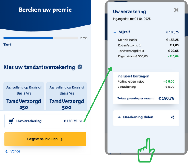 - Toon precies hoe elke keuze de kosten beïnvloedt ("+ €3,50/maand voor extra dekking").