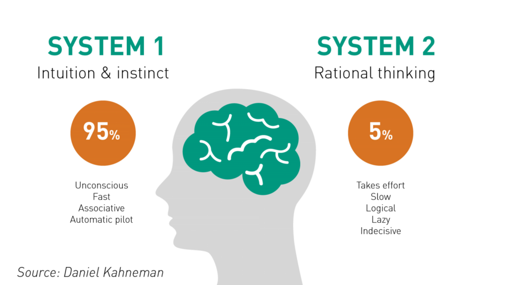Systeem 1: Snel, intuïtief en emotioneel denken. Dit systeem reageert direct op prikkels, vaak gedreven door buikgevoel.