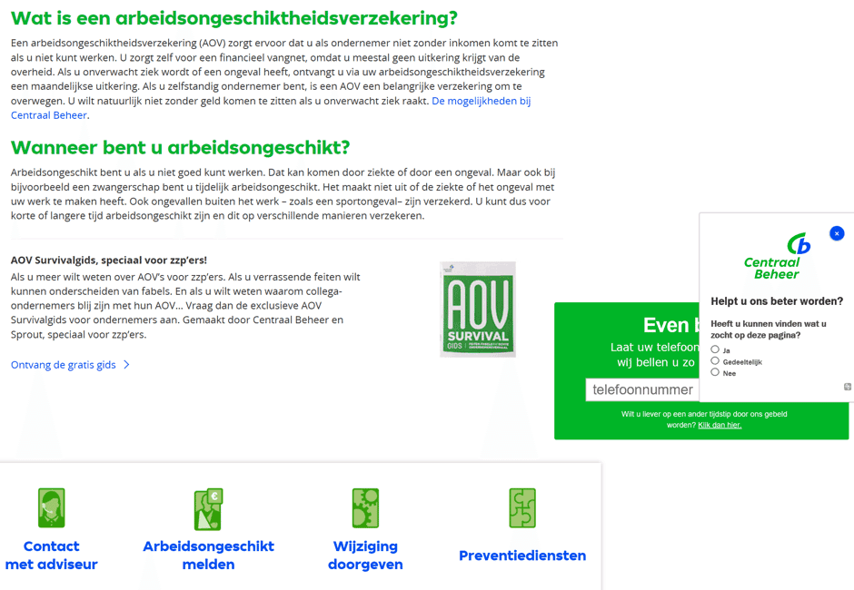 Er wordt allerlei algemene informatie rondom AOV gegeven, naast informatie over het specifieke AOV aanbod van CentraalBeheer.nl. Hierdoor is de website ook informatief voor mensen die geen klant van CentraalBeheer.nl zijn of worden. Er worden bovendien duidelijke redenen genoemd om wel of geen AOV af te sluiten. Dit geeft de indruk dat het bedrijf belang hecht aan het geven van het best passende advies voor elke consument, of dit nu direct in hun eigen voordeel is of niet. CentraalBeheer.nl laat zelfstandige ondernemers aan het woord, waarmee consumenten zich kunnen identificeren en hun eigen situatie kunnen projecteren om beter inzicht te krijgen in hun eigen behoeften.