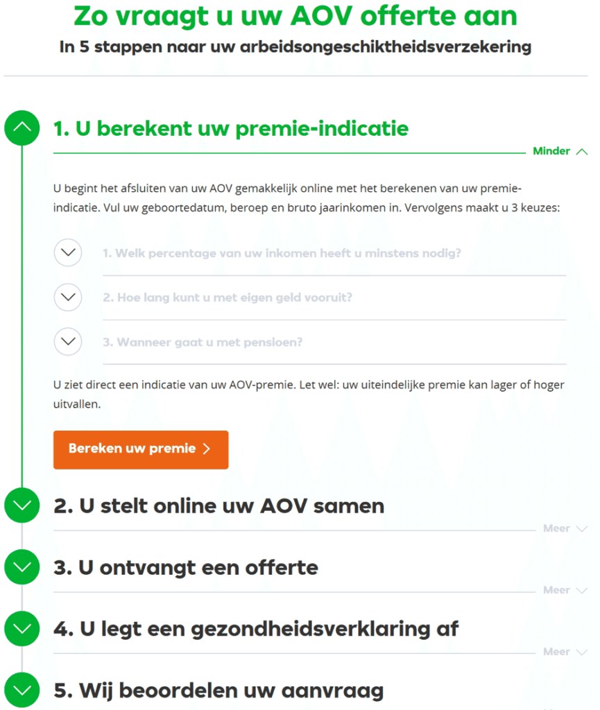 Weer verder omlaag staat een duidelijk overzicht met wat wel en niet gedekt wordt door de AOV van CentraalBeheer.nl, zodat de consument meteen weet waar hij aan toe is, zonder addertjes onder het gras. “Het aanbod is duidelijk, goed leesbaar en laat je niet met vragen achter.” Bij het aanvragen van een offerte worden alle stappen in het proces duidelijk en logisch weergegeven, zodat de consument meteen kan zien wat hij moet doen en kan verwachten.
